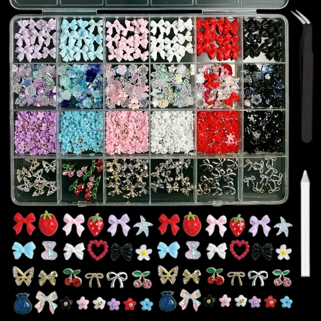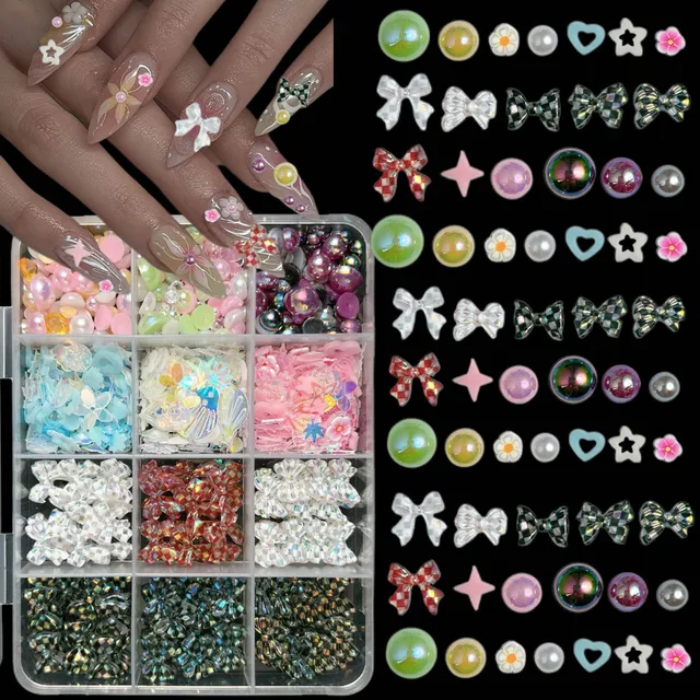 12 Grids 3D Nail Charms Flatback Pearls Pink White Bowknot Charms Heart for Nail Art Design With Pickup Tools DIY Nail Supplies